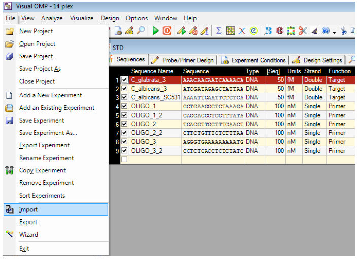 問題を起こしているプライマーやプローブが同定された後は、Visual OMPs デザインソフトを用いて、既存のオリゴヌクレオチドの存在条件でアッセイの感度と特異性を最適化した新たなオリゴヌクレオチドをデザインします。既存の配列はfastaファイル形式でVisual OMPに取り込まれますが、配列に名称が付けられてない場合はOligo_1、_2といったように名付けられます。