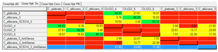 Visual OMP™ のクロスハイブリダイゼーショングリッドを一目見ることでオリゴヌクレオチド間のヘテロダイマー形成を直感的に理解することが可能であり、クロスハイブリダイゼーションやミスハイブリダイゼーションが起こると予想されるプローブとターゲット配列の組み合わせを決定することが可能です。