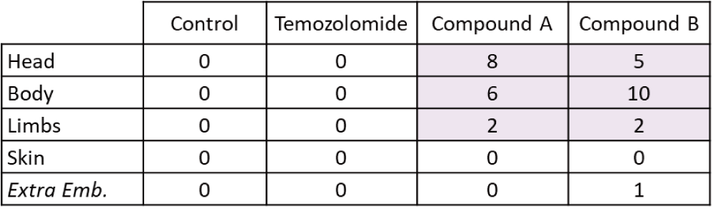 Body: size, axis deformation, ventral and dorsal closures, caudal formation, sexual area