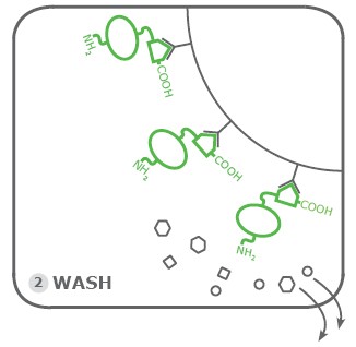 精製対象以外のタンパク質やその他のライセート構成物は洗浄により除去され、対象タンパク質のみがアフィニティレジンに結合された状態で残存します。