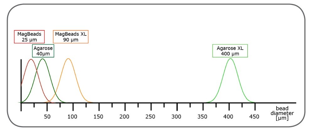 図1 【標準およびXLサイズのPureCubeアガロースおよび磁気ビーズのサイズ分布】