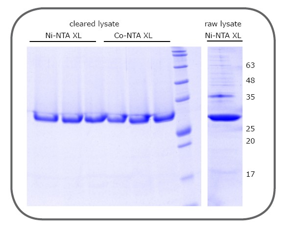 標準のHisアフィニティレジンとは対照的にコバルトイオン複合体のHisタグに対する選択性はニッケルと同等であり、同等の純度を実現します。