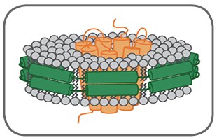 緑:膜スキャフォールドタンパク質(MSP)、灰色:リン脂質、オレンジ:再構成膜タンパク質