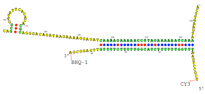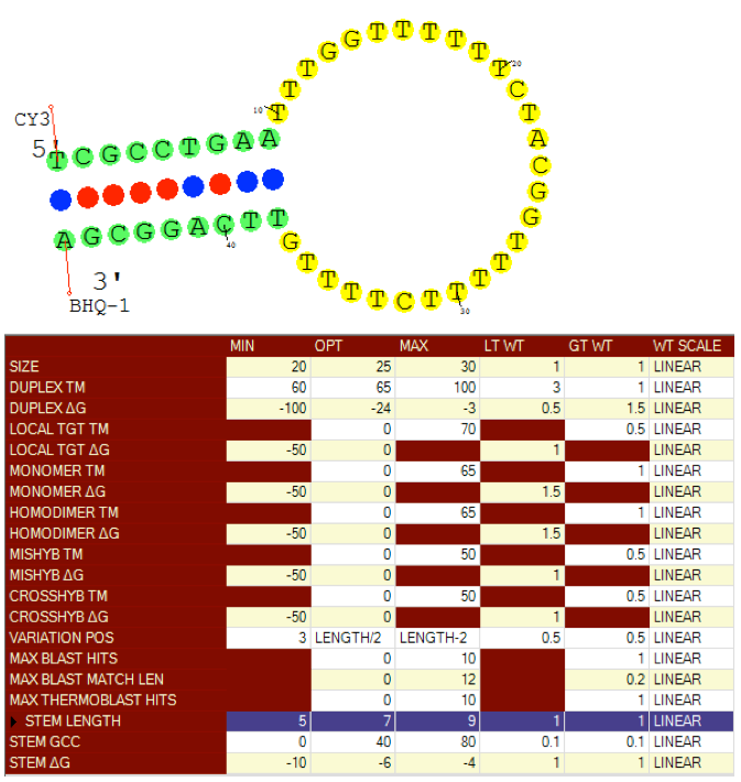 製品・サービス モレキュラービーコンデザイン Visual OMP™を用いることで、分子ビーコンやアレル特異的分子ビーコンペアを両方デザインすることが可能です。 ループ構造やステム構造のサイズ、融解温度、および自由エネルギー変化がビーコンの特異性および感度向上のために最適化されます。 ビーコンのステム構造は近接する配列に誤って結合して消光することを防止するようにデザインされ、ステム構造末端のG/Cペアの数は必要なスペックにあわせて最適化可能です。