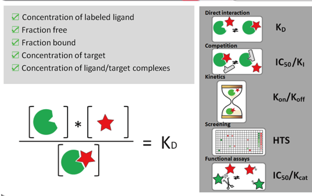 2色のラベルを使用することによってターゲットおよびリガンドの両方の濃度と、ターゲットとリガンドの特異的な結合による複合体の濃度を算出できます。