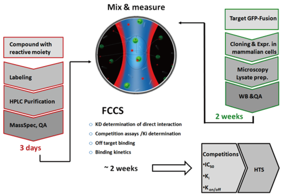 FCCSではラベルされたターゲットとラベルされたリガンドの間の相互作用を測定します。