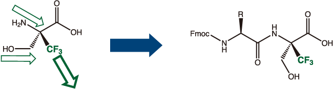 究極的には、セリンに対応するα-トリフルオロメチルアミノ酸またはヒドロキシ官能基におけるα-アミノ官能基は、標準的なSPPSプロトコール中に保護される必要はありません。電子吸引性が高く、α-トリフルオロメチル基の求核性が、アシル化が起こらない程度に大幅に低減されるためです。