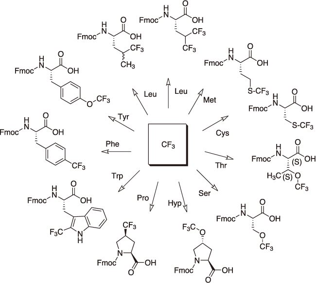 トリフルオロメチル基は、Phe、TrpおよびTyrの芳香族環や、チオール、ヒドロキシルまたはアミンのような官能基にも付加することが可能で、メチル基の水素を置換することによって形成することが可能です。