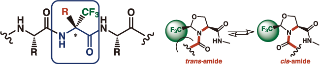 トリフルオロメチル基を含むビルディングブロックのペプチドへの組み込みは、化学的および熱的安定性の増加、プロテアーゼによる分解に対する耐性の上昇、および親油性の向上をもたらします。したがって適切にデザインされたペプチドは、脂質膜に対するより強力な親和性および受容体とのより強い相互作用を示します。電子的および立体的な理由の両方が作用し、トリフルオロメチルアミノ酸ではcis – アミド結合が好まれるため、β-ターンの形成が誘導される結果となります。