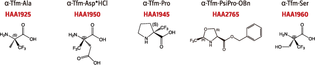 Cα-メチルアミノ酸はキラル中心での立体的な制限が増加することにより、特定の立体配座を取りやすい傾向にあることが特徴です。自己集積化を誘発することさえあるフッ素の強い分極特性を有するトリフルオロメチル基と組み合わさることにより、この特徴が更に強化されます。