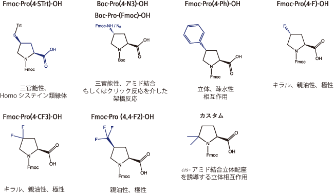 官能基を適宜追加することによって、3種類の架橋反応に対する活性部位または疎水性相互作用といった特性を有するプロリンとして使用することが可能です。