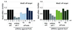 siPOOL™は単独のsiRNAやsiRNAの組み合わせによる実験の場合に観測されるoff-target効果と比較し、無視できる程度のoff-target効果を示します。